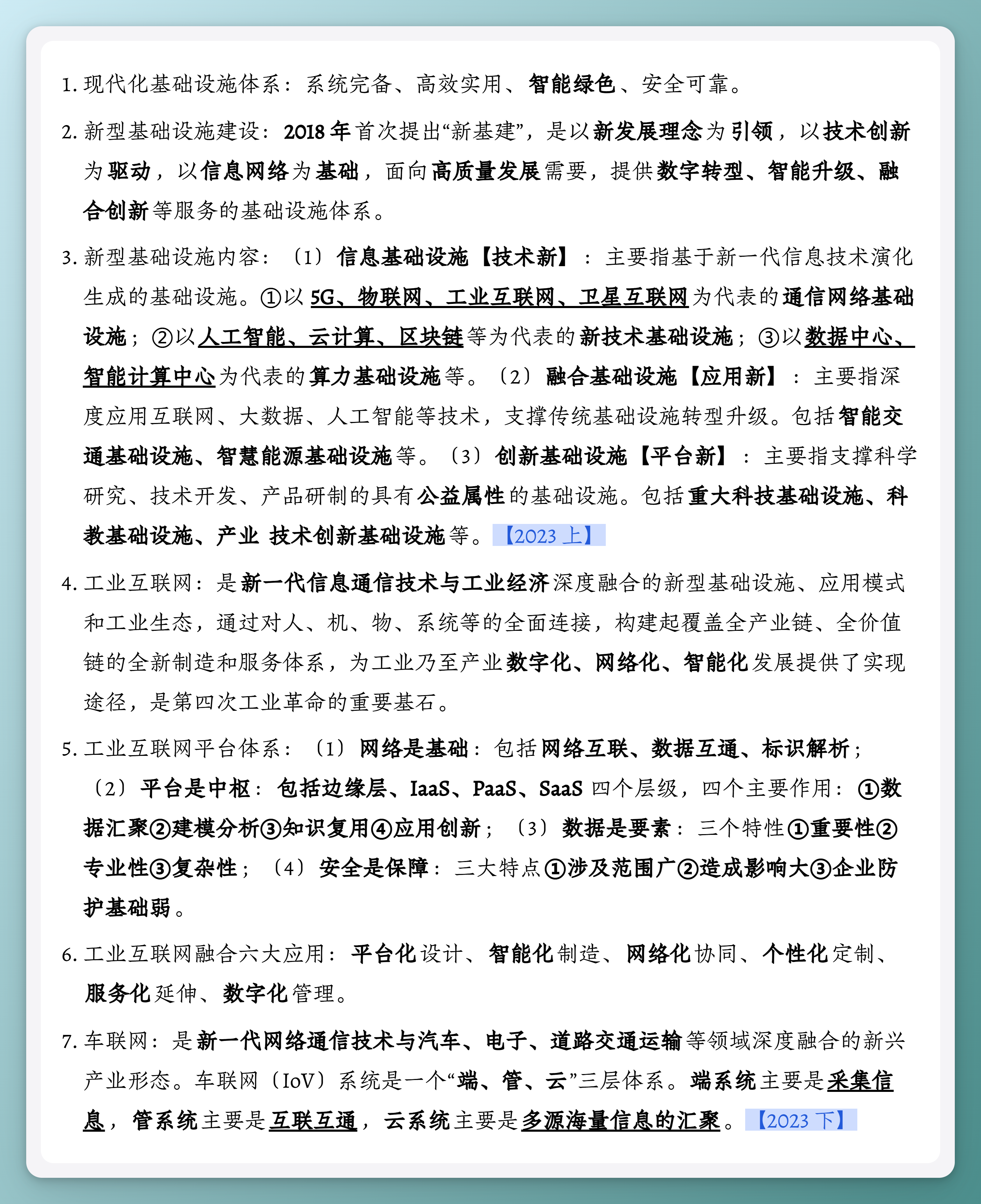 - 新型基础设施建设:2018 年首次提出“新基建”,是以新发展理念为引领,以技术创新为驱动,以信息网络为基础,面向高质量发展需要,提供数字转型、智能升级、融合创新等服务的基础设施体系。
