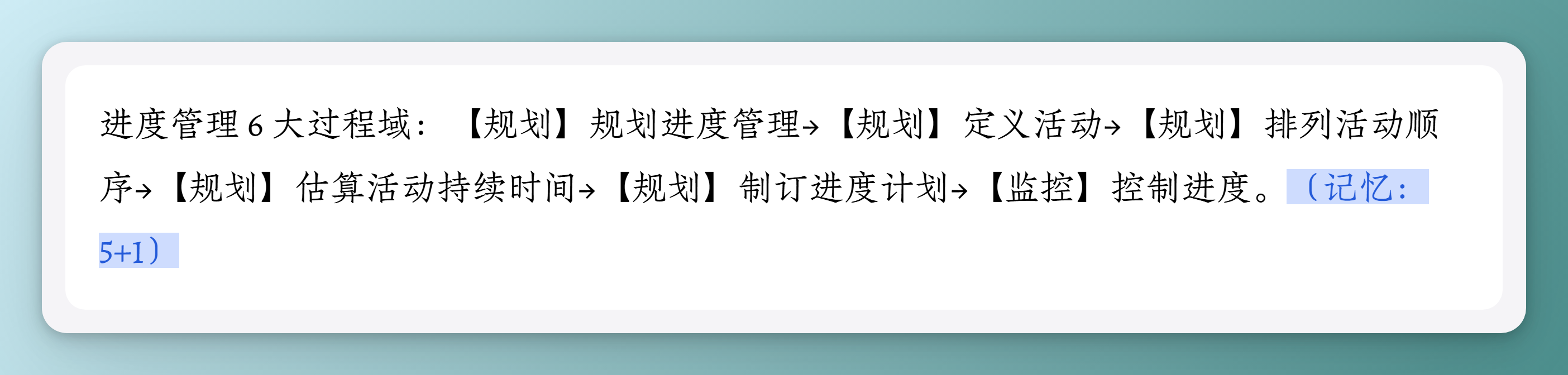 进度管理 6 大过程域:【规划】规划进度管理→【规划】定义活动→【规划】排列活动顺序→【规划】估算活动持续时间→【规划】制订进度计划→【监控】控制进度。(记忆:5+1)