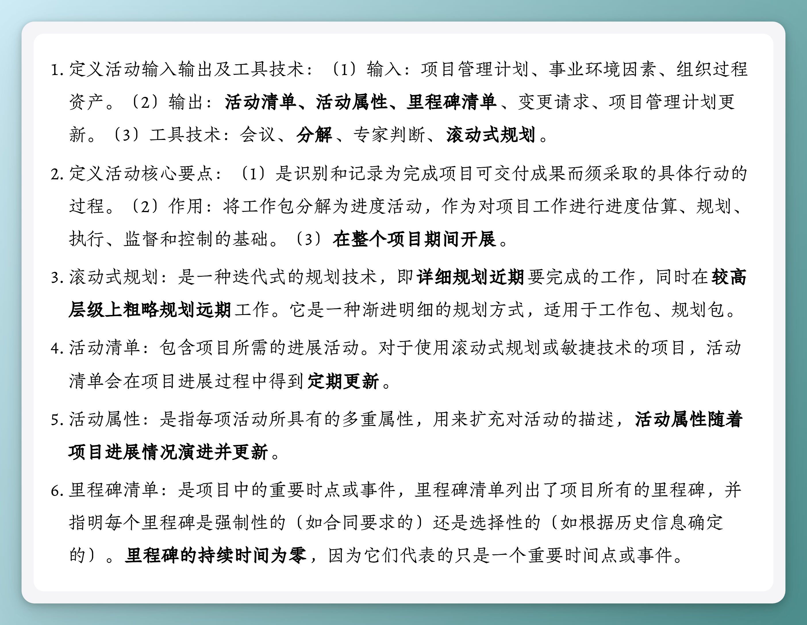 - 定义活动输入输出及工具技术:(1)输入:项目管理计划、事业环境因素、组织过程资产。(2)输出:活动清单、活动属性、里程碑清单、变更请求、项目管理计划更新。(3)工具技术:会议、分解、专家判断、滚动式规划。