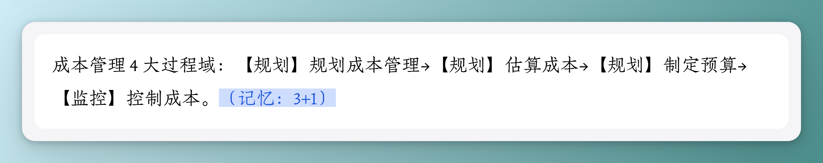 成本管理 4 大过程域:【规划】规划成本管理→【规划】估算成本→【规划】制定预算→【监控】控制成本。(记忆:3+1)