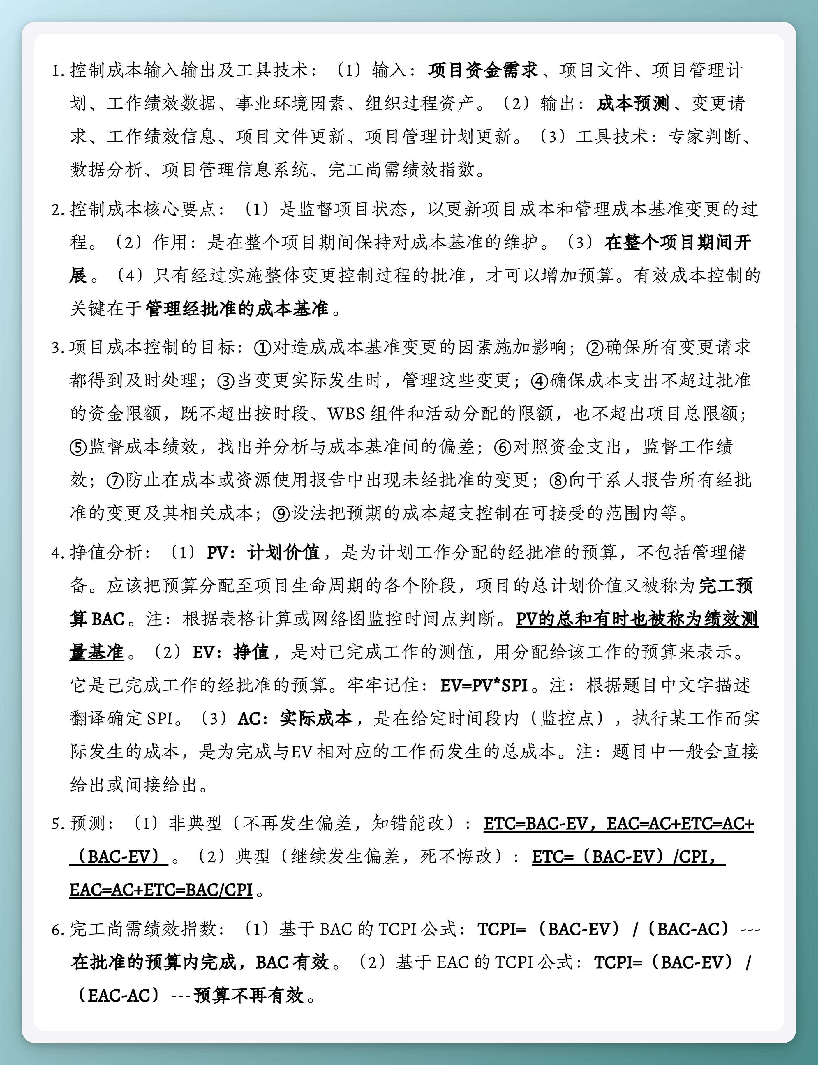 - 控制成本输入输出及工具技术:(1)输入:项目资金需求、项目文件、项目管理计划、工作绩效数据、事业环境因素、组织过程资产。(2)输出:成本预测、变更请求、工作绩效信息、项目文件更新、项目管理计划更新。(3)工具技术:专家判断、数据分析、项目管理信息系统、完工尚需绩效指数。