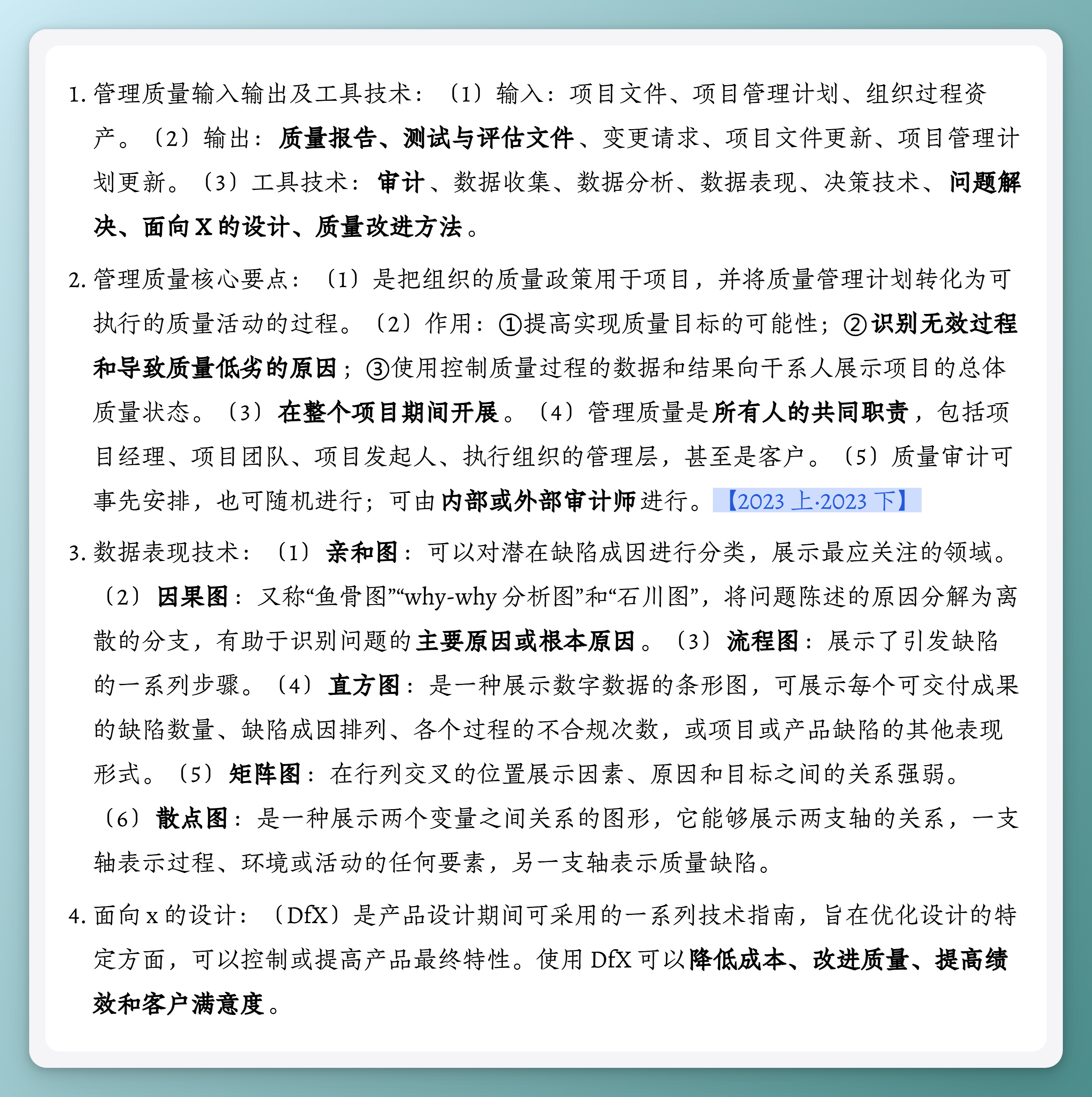 - 管理质量输入输出及工具技术:(1)输入:项目文件、项目管理计划、组织过程资产。(2)输出:质量报告、测试与评估文件、变更请求、项目文件更新、项目管理计划更新。(3)工具技术:审计、数据收集、数据分析、数据表现、决策技术、问题解决、面向 X 的设计、质量改进方法。
