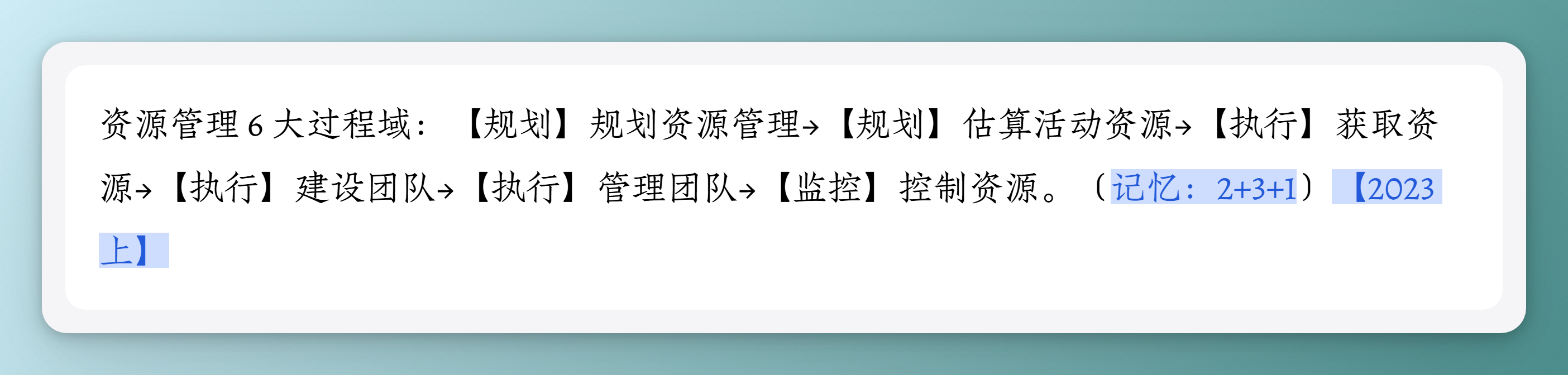 资源管理 6 大过程域:【规划】规划资源管理→【规划】估算活动资源→【执行】获取资源→【执行】建设团队→【执行】管理团队→【监控】控制资源。(记忆:2+3+1)【2023 上】
