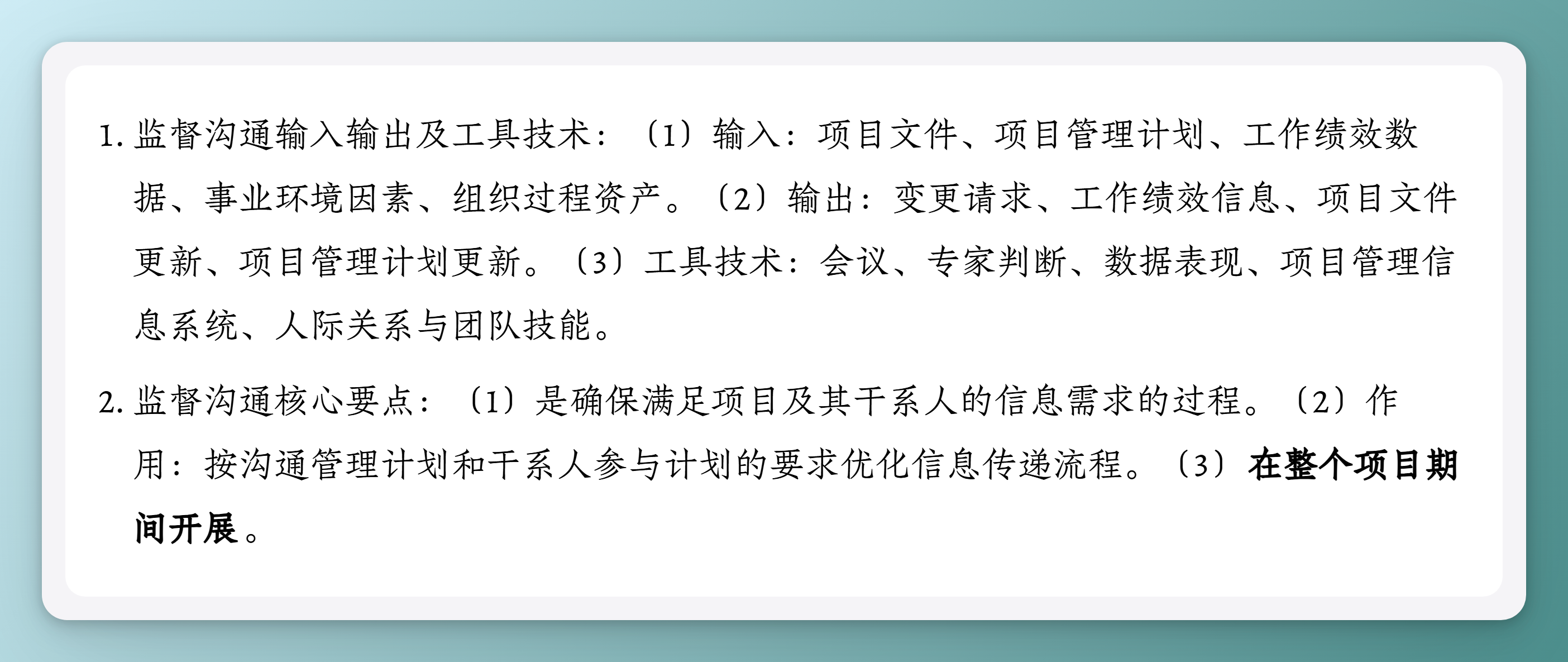 监督沟通输入输出及工具技术:(1)输入:项目文件、项目管理计划、工作绩效数据、事业环境因素、组织过程资产。(2)输出:变更请求、工作绩效信息、项目文件更新、项目管理计划更新。(3)工具技术:会议、专家判断、数据表现、项目管理信息系统、人际关系与团队技能。