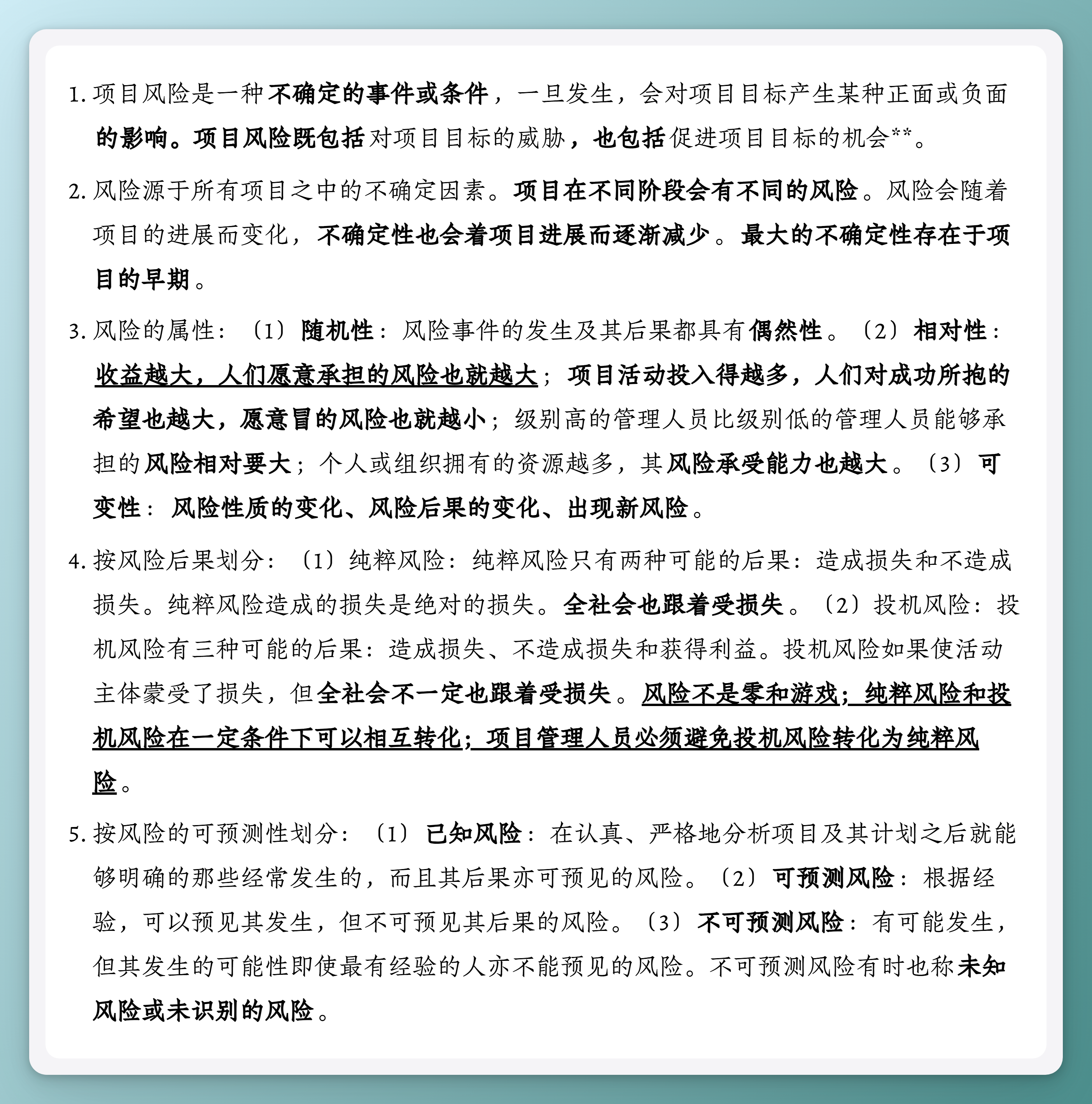 1. 项目风险是一种不确定的事件或条件,一旦发生,会对项目目标产生某种正面或负面的影响。项目风险既包括对项目目标的威胁**,也包括促进项目目标的机会