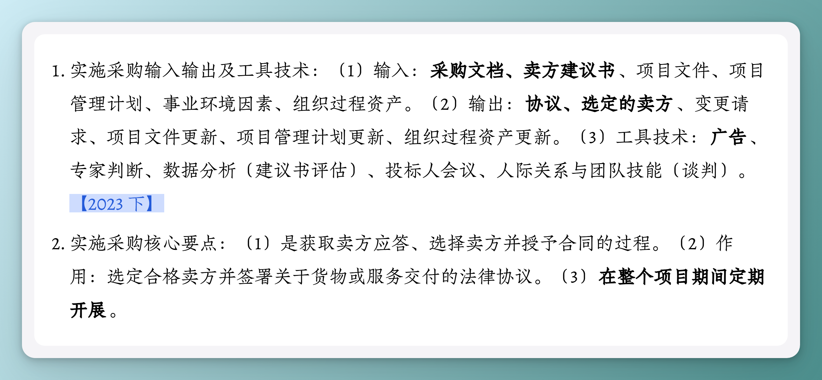 实施采购核心要点:(1)是获取卖方应答、选择卖方并授予合同的过程。(2)作用:选定合格卖方并签署关于货物或服务交付的法律协议。(3)