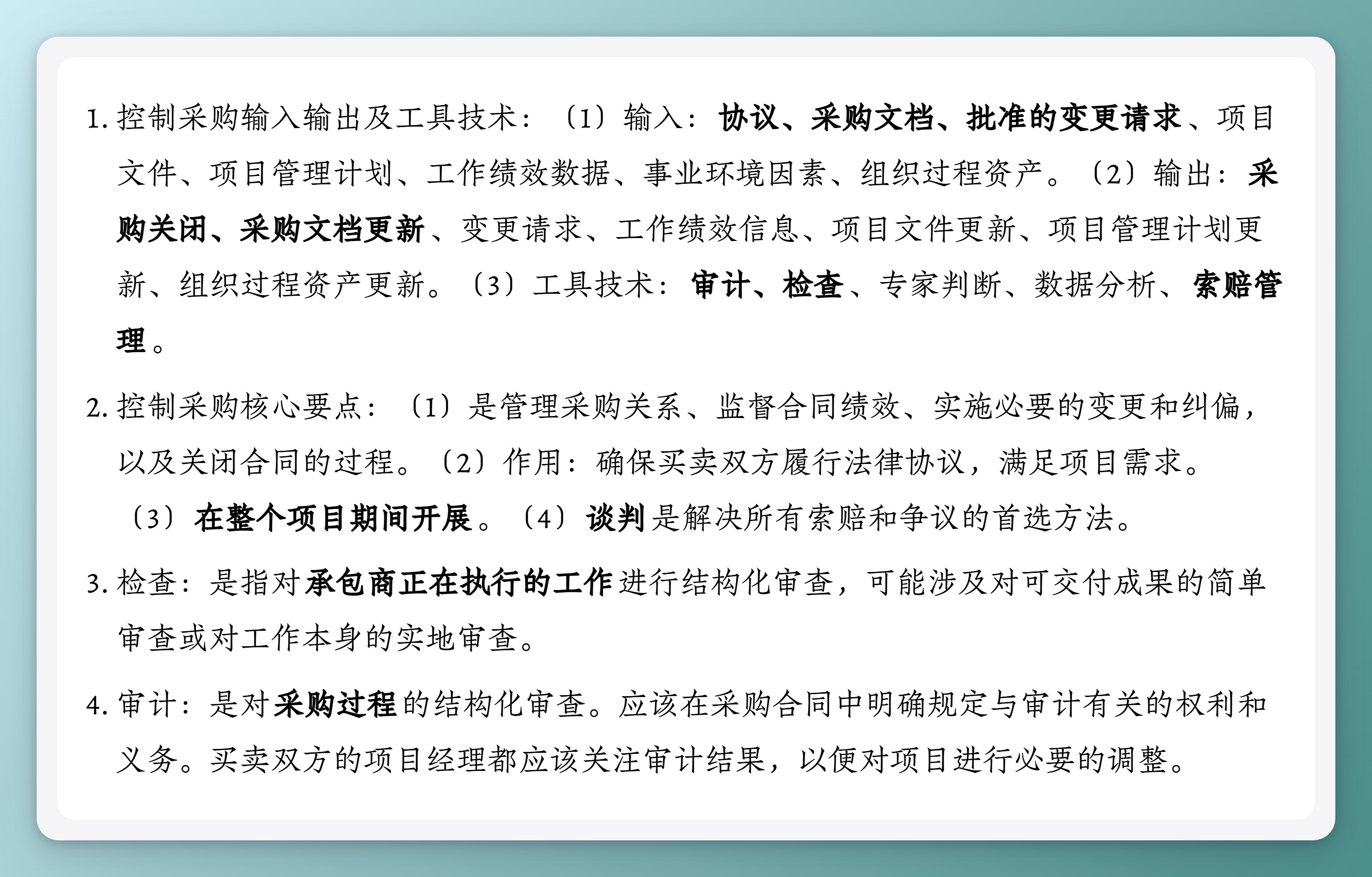 - 控制采购输入输出及工具技术:(1)输入:协议、采购文档、批准的变更请求、项目文件、项目管理计划、工作绩效数据、事业环境因素、组织过程资产。(2)输出:采购关闭、采购文档更新、变更请求、工作绩效信息、项目文件更新、项目管理计划更新、组织过程资产更新。(3)工具技术:审计、检查、专家判断、数据分析、索赔管理。