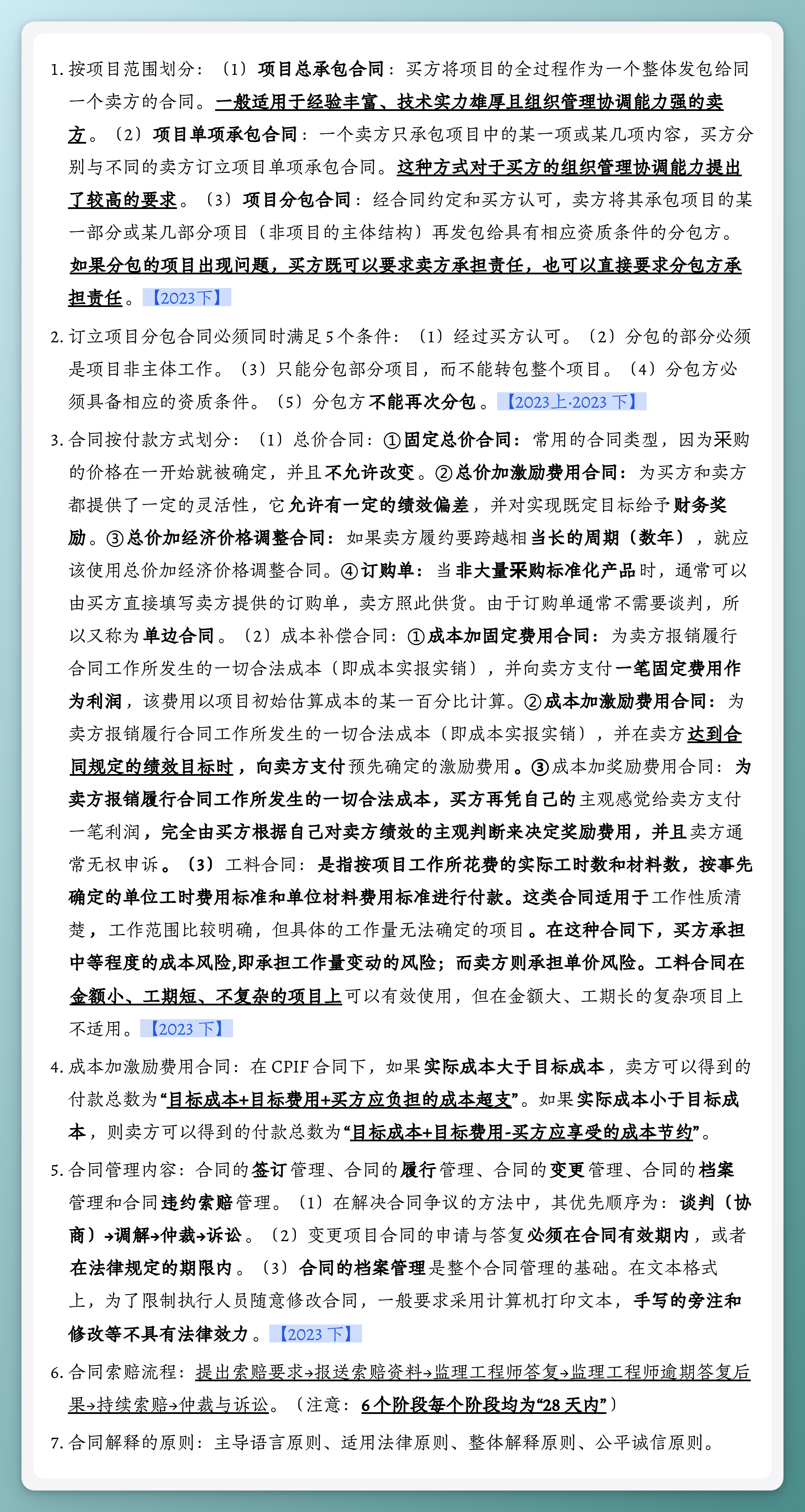 - 合同按付款方式划分:(1)总价合同:①固定总价合同:常用的合同类型,因为釆购的价格在一开始就被确定,并且不允许改变。②总价加激励费用合同:为买方和卖方都提供了一定的灵活性,它允许有一定的绩效偏差,并对实现既定目标给予财务奖励。③总价加经济价格调整合同:如果卖方履约要跨越相当长的周期(数年),就应该使用总价加经济价格调整合同。④订购单:当非大量釆购标准化产品时,通常可以由买方直接填写卖方提供的订购单,卖方照此供货。由于订购单通常不需要谈判,所以又称为单边合同。(2)成本补偿合同:①成本加固定费用合同:为卖方报销履行合同工作所发生的一切合法成本(即成本实报实销),并向卖方支付一笔固定费用作为利润,该费用以项目初始估算成本的某一百分比计算。②成本加激励费用合同:为卖方报销履行合同工作所发生的一切合法成本(即成本实报实销),并在卖方达到合同规定的绩效目标时,向卖方支付预先确定的激励费用。③成本加奖励费用合同:为卖方报销履行合同工作所发生的一切合法成本,买方再凭自己的主观感觉给卖方支付一笔利润,完全由买方根据自己对卖方绩效的主观判断来决定奖励费用,并且卖方通常无权申诉。(3)工料合同:是指按项目工作所花费的实际工时数和材料数,按事先确定的单位工时费用标准和单位材料费用标准进行付款。这类合同适用于工作性质清楚,工作范围比较明确,但具体的工作量无法确定的项目。在这种合同下,买方承担中等程度的成本风险,即承担工作量变动的风险;而卖方则承担单价风险。工料合同在金额小、工期短、不复杂的项目上**可以有效使用,但在金额大、工期长的复杂项目上不适用。【2023 下】