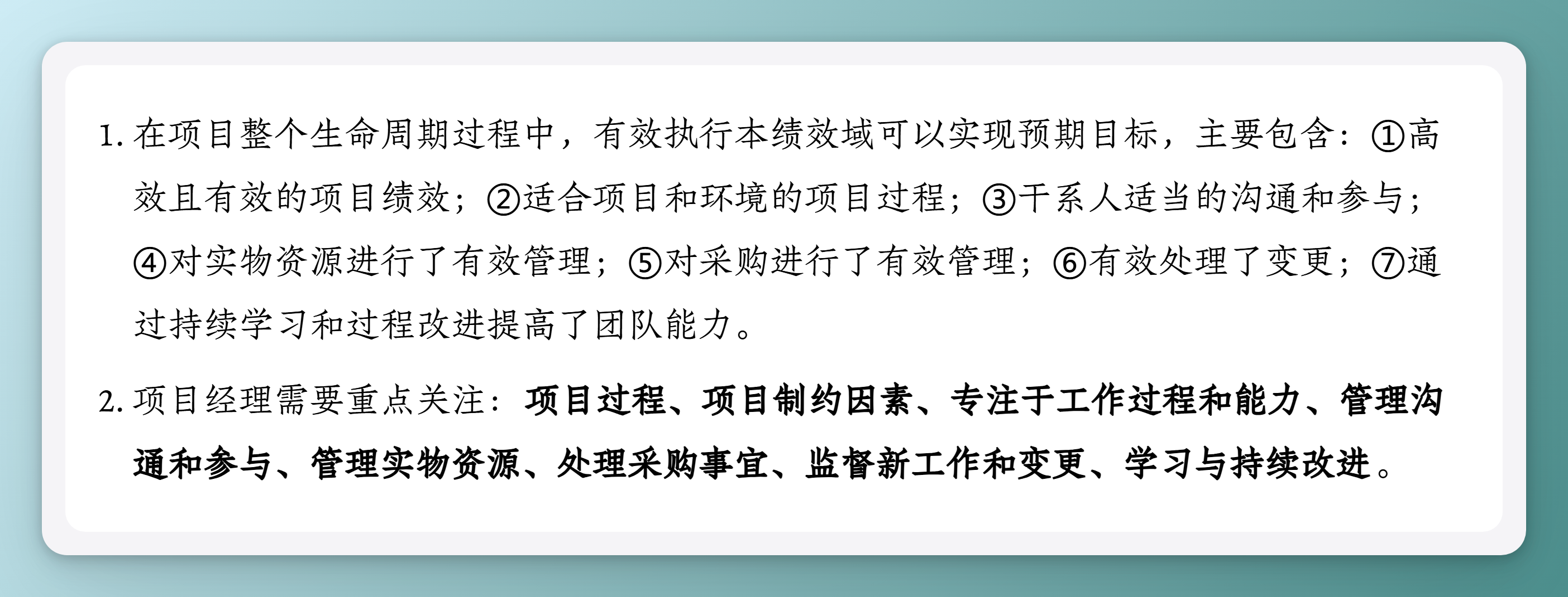 在项目整个生命周期过程中,有效执行本绩效域可以实现预期目标,主要包含:①高效且有效的项目绩效;②适合项目和环境的项目过程;③干系人适当的沟通和参与;④对实物资源进行了有效管理;⑤对采购进行了有效管理;⑥有效处理了变更;⑦通过持续学习和过程改进提高了团队能力。