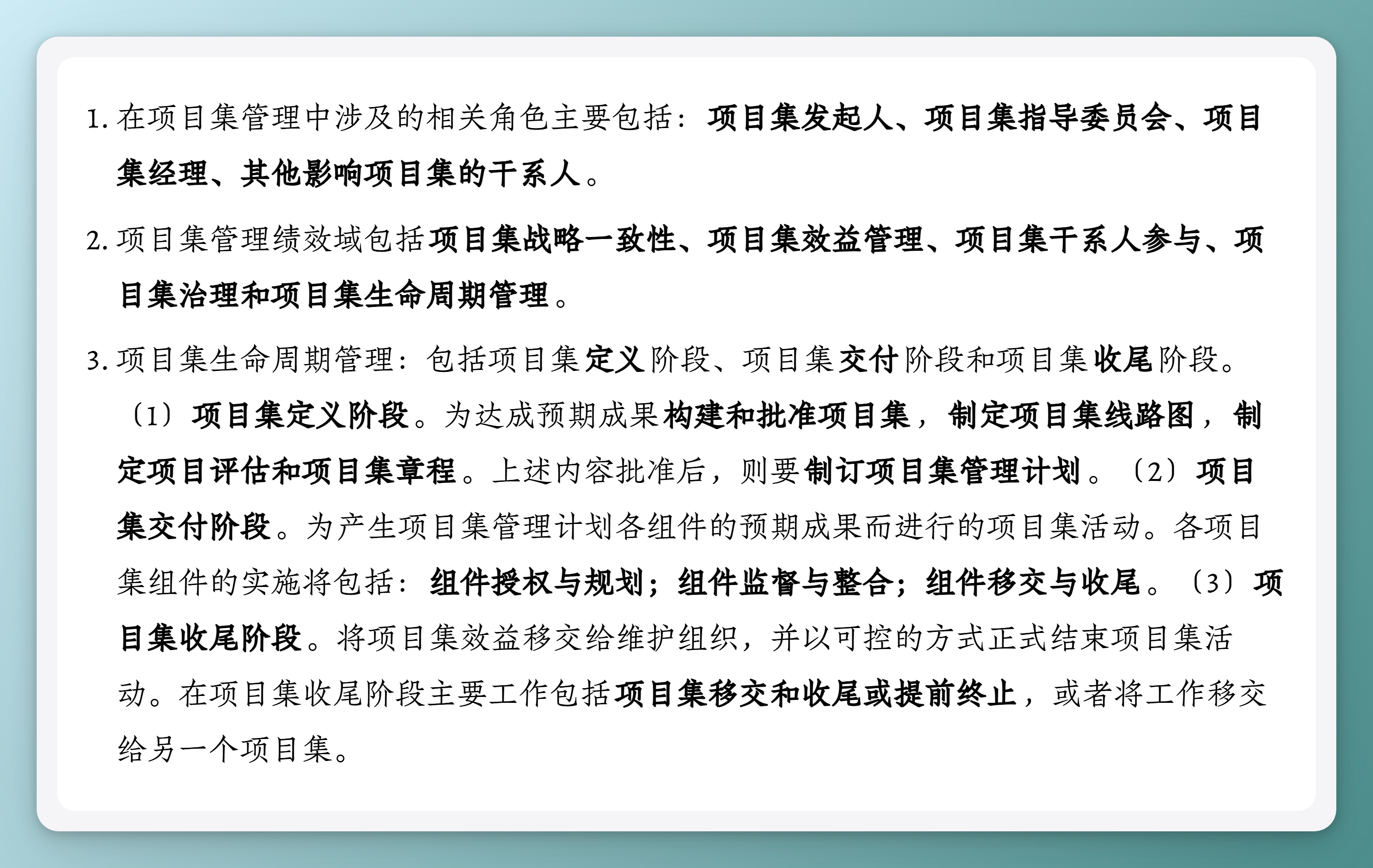 项目集生命周期管理:包括项目集定义阶段、项目集交付阶段和项目集收尾阶段。(1)项目集定义阶段。为达成预期成果构建和批准项目集,制定项目集线路图,制定项目评估和项目集章程。上述内容批准后,则要制订项目集管理计划。(2)项目集交付阶段。为产生项目集管理计划各组件的预期成果而进行的项目集活动。各项目集组件的实施将包括:组件授权与规划;组件监督与整合;组件移交与收尾。(3)项目集收尾阶段。将项目集效益移交给维护组织,并以可控的方式正式结束项目集活动。在项目集收尾阶段主要工作包括项目集移交和收尾或提前终止,或者将工作移交给另一个项目集。