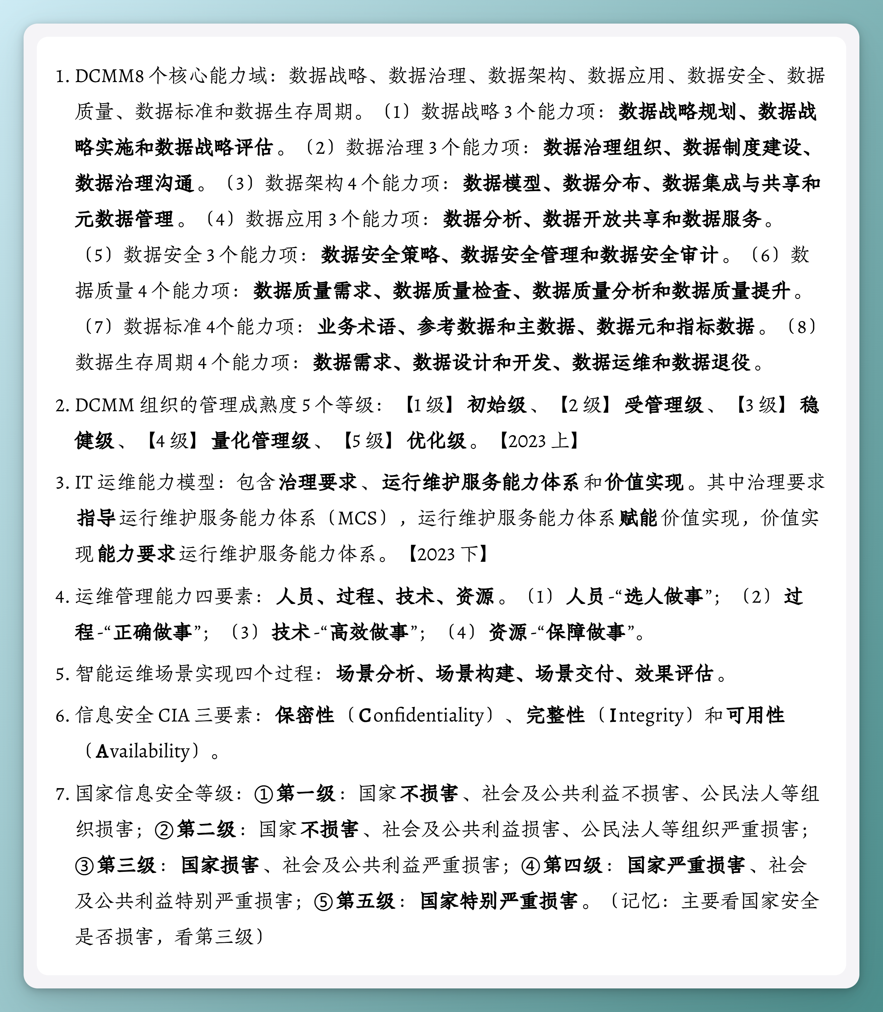 IT 运维能力模型:包含治理要求、运行维护服务能力体系和价值实现。其中治理要求指导运行维护服务能力体系(MCS),运行维护服务能力体系赋能价值实现,价值实现能力要求运行维护服务能力体系。【2023 下】