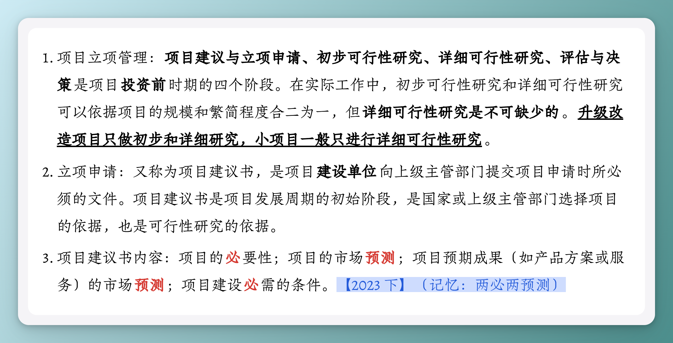 - 项目建议书内容:项目的必要性;项目的市场预测;项目预期成果(如产品方案或服务)的市场预测;项目建设必需的条件。【2023 下】(记忆:两必两预测)