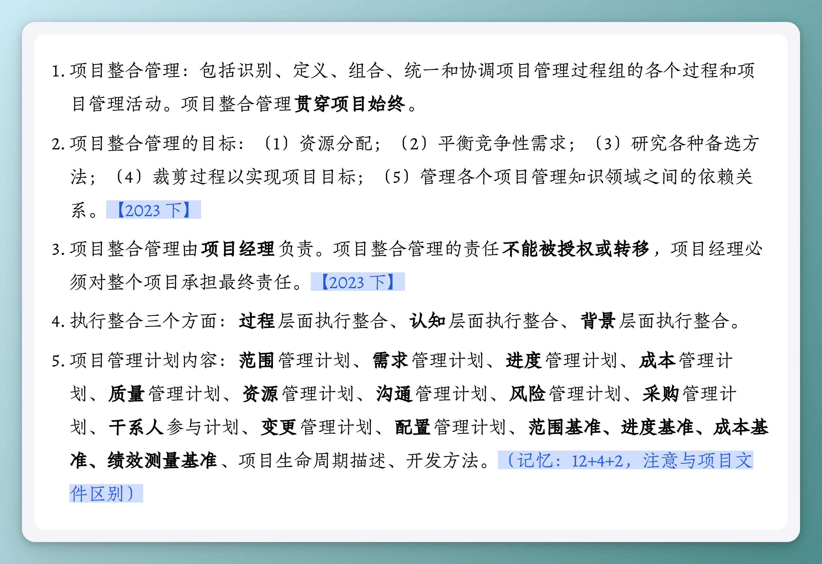 - 项目整合管理的目标:(1)资源分配;(2)平衡竞争性需求;(3)研究各种备选方法;(4)裁剪过程以实现项目目标;(5)管理各个项目管理知识领域之间的依赖关系。【2023 下】