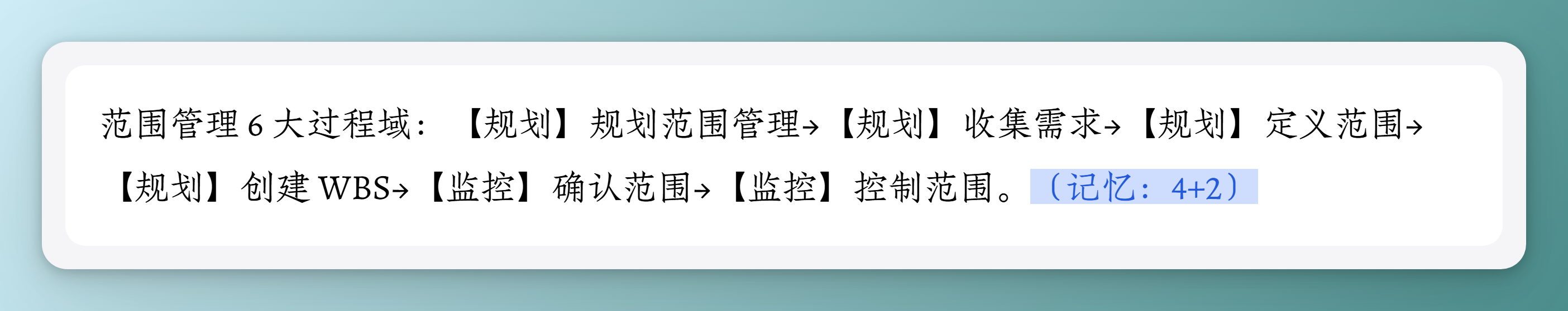 范围管理 6 大过程域:【规划】规划范围管理→【规划】收集需求→【规划】定义范围→【规划】创建 WBS→【监控】确认范围→【监控】控制范围。(记忆:4+2)
