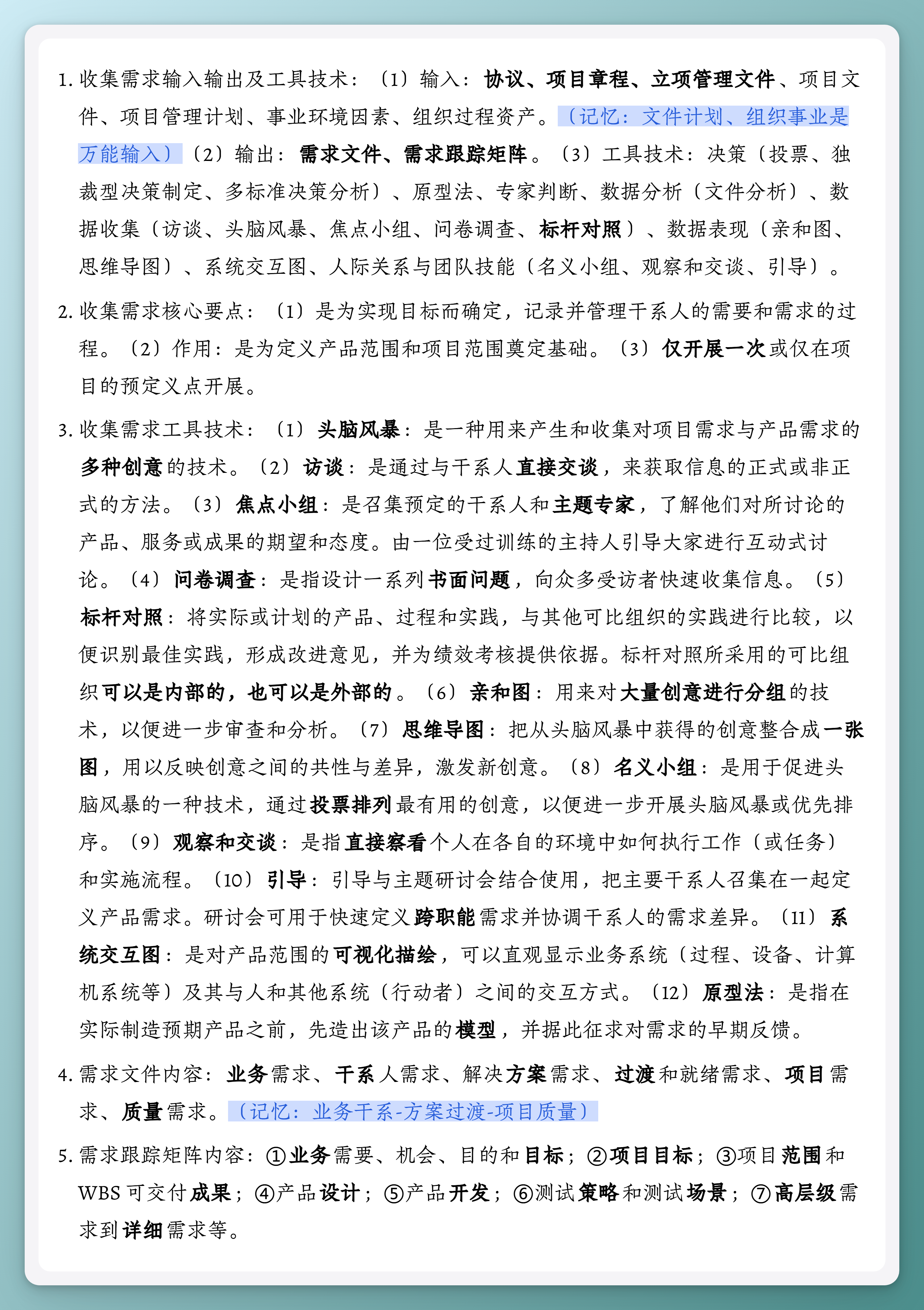- 需求文件内容:业务需求、干系人需求、解决方案需求、过渡和就绪需求、项目需求、质量需求。(记忆:业务干系-方案过渡-项目质量)