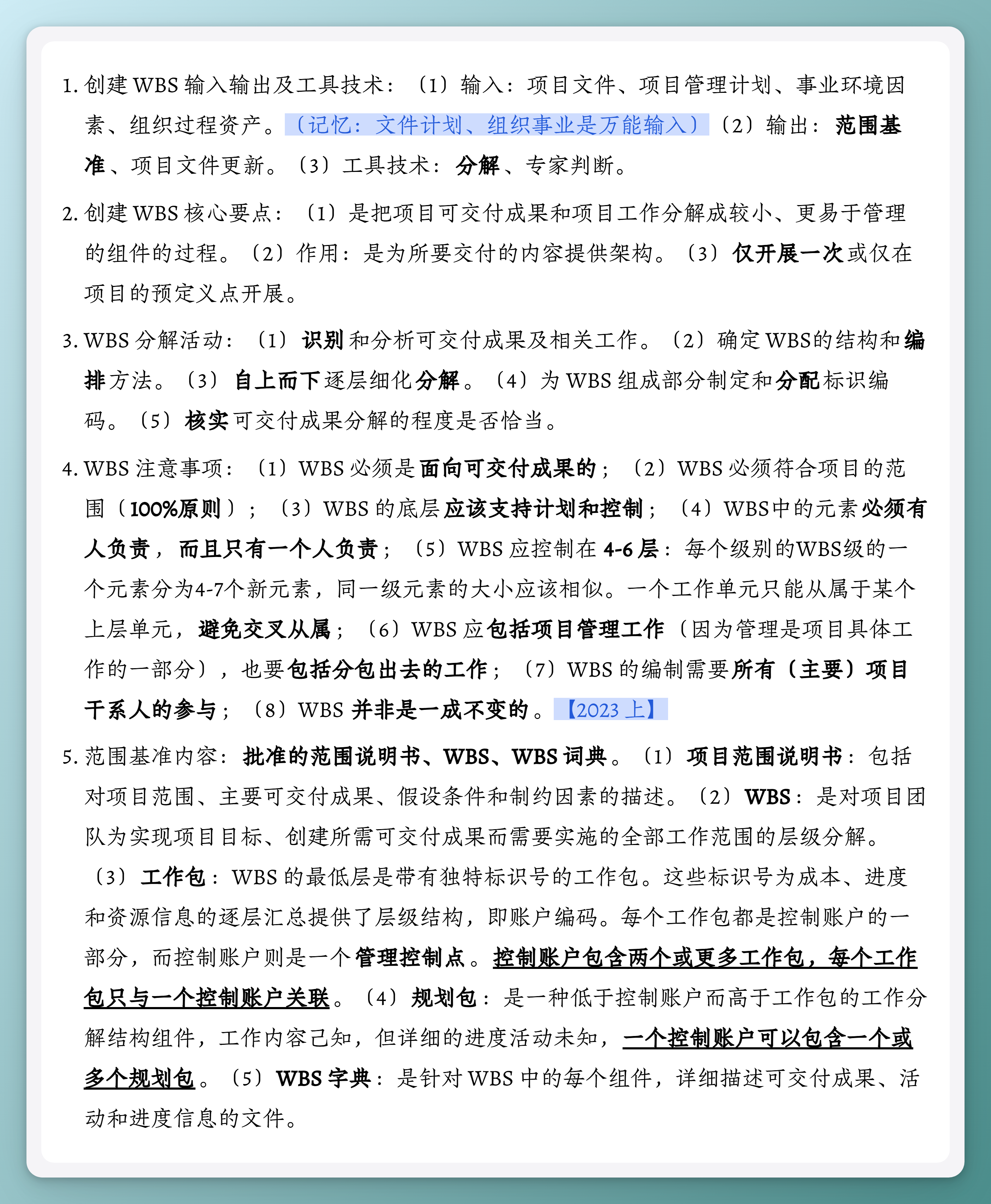 - 创建 WBS 输入输出及工具技术:(1)输入:项目文件、项目管理计划、事业环境因素、组织过程资产。(记忆:文件计划、组织事业是万能输入)(2)输出:范围基准、项目文件更新。(3)工具技术:分解、专家判断。