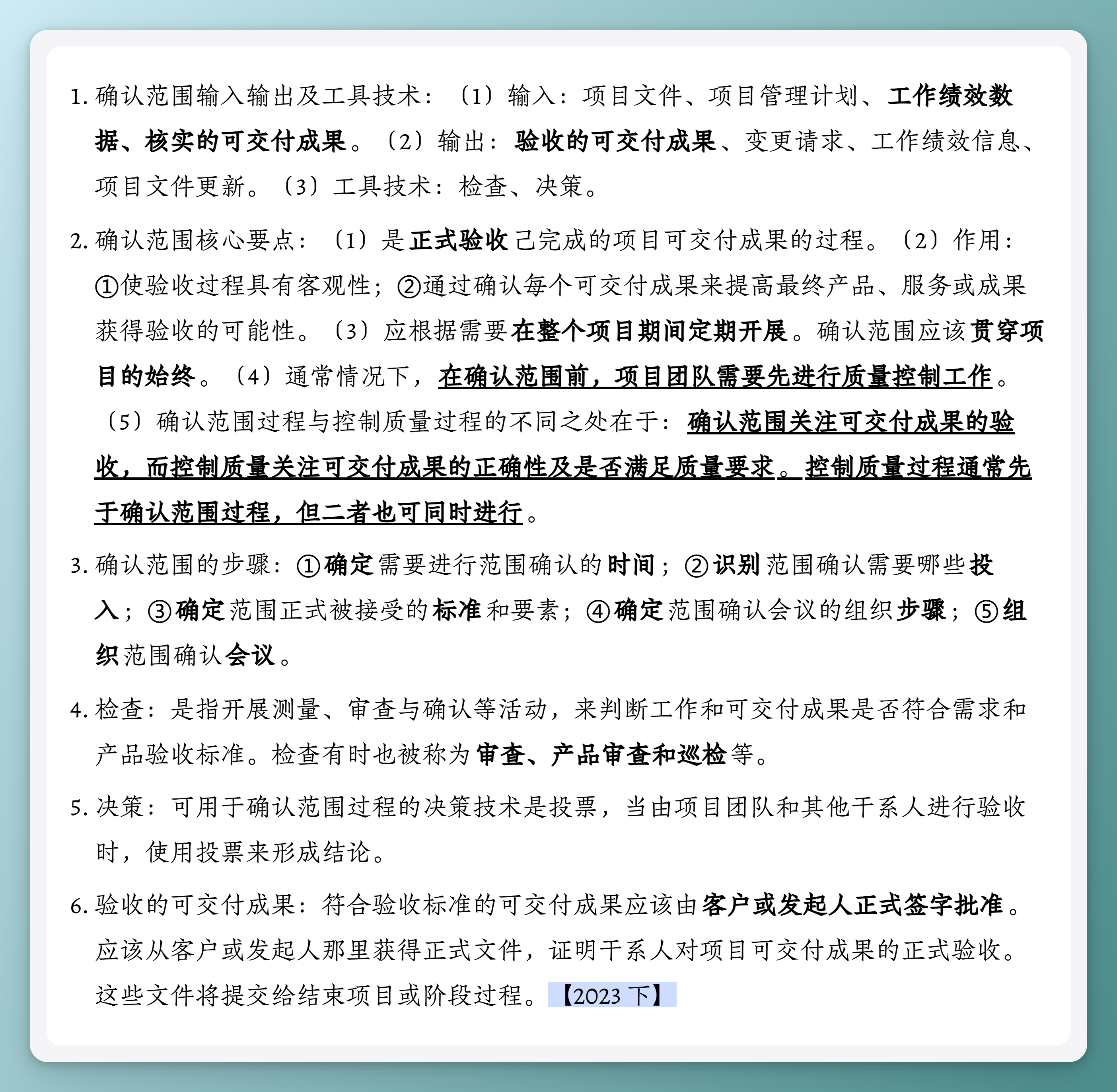 - 确认范围输入输出及工具技术:(1)输入:项目文件、项目管理计划、工作绩效数据、核实的可交付成果。(2)输出:验收的可交付成果、变更请求、工作绩效信息、项目文件更新。(3)工具技术:检查、决策。